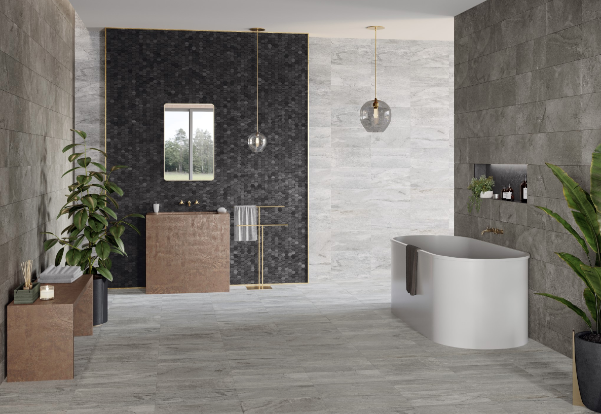 Courtyard range of stone-look tiles is available in three colours. Textured matt finish with a slight sparkle in a full-body colour and non-rectified edges.
