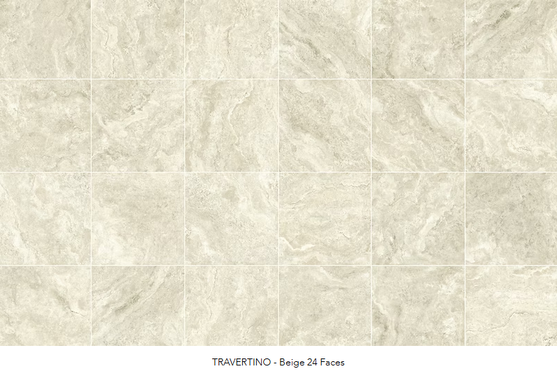 It comes in a single unique finish called Tech Grip. This finish is incredibly smooth to touch, but is also able to achieve a P5 rating when wet, this allows it to be used internally and externally creating a seamless look between the two. With 24 different faces an authentic mica imbedded surface to give a truly realistic look, this travertine tile captures the natural beauty of stone, without any of the maintenance.