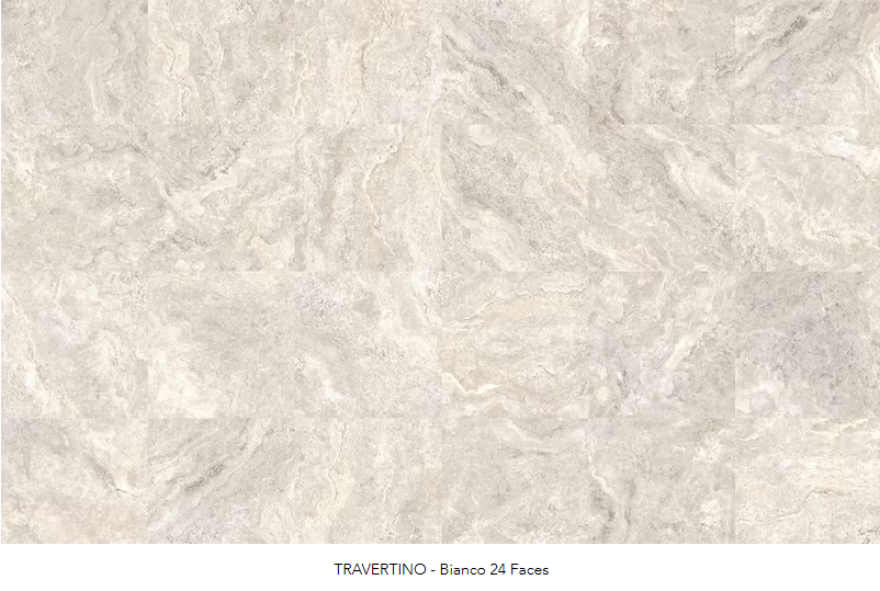 It comes in a single unique finish called Tech Grip. This finish is incredibly smooth to touch, but is also able to achieve a P5 rating when wet, this allows it to be used internally and externally creating a seamless look between the two. With 24 different faces an authentic mica imbedded surface to give a truly realistic look, this travertine tile captures the natural beauty of stone, without any of the maintenance.